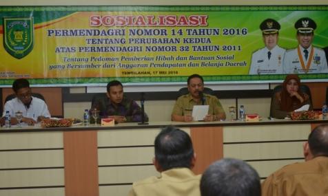 TEMBILAHAN -- Pemerintah Kabupaten Inhil gelar Sosialisasi Permendagri Nomor 14 Tahun 2016 tentang perubahan kedua atas Permendagri No 32 Tahun 2011 tentang pedoman pemberian hibah dan bantuan sosial yang bersumber dari APBD Tahun Anggaran 2016 di lingkungan Pemkab Inhil, Selasa 17 Mei 2016.