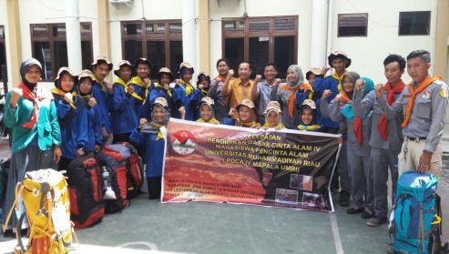 PEKANBARU -- Dalam rangka mengikuti pendidikan lapangan, Mahasiswa Pencinta Alam (Mapala) Universitas Muhammadiyah Riau (UMRI) dilepaskan keberangkatannya ke Desa Tanjung Belit, Lipat Kain Kecamatan Kampar Kiri Kabupaten Kampar, Rabu 30 Nopember 2016.