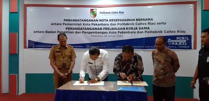 Gaungriau.com (PEKANBARU) -- Politeknik Caltex Riau (PCR) dan Badan Penelitian dan Pengembangan (Balitbang) Kota Pekanbaru sepakat untuk melakukan kerjasama. Kerjasama ini ditandai dengan penandatanganan Memorandum of Understanding (MoU).