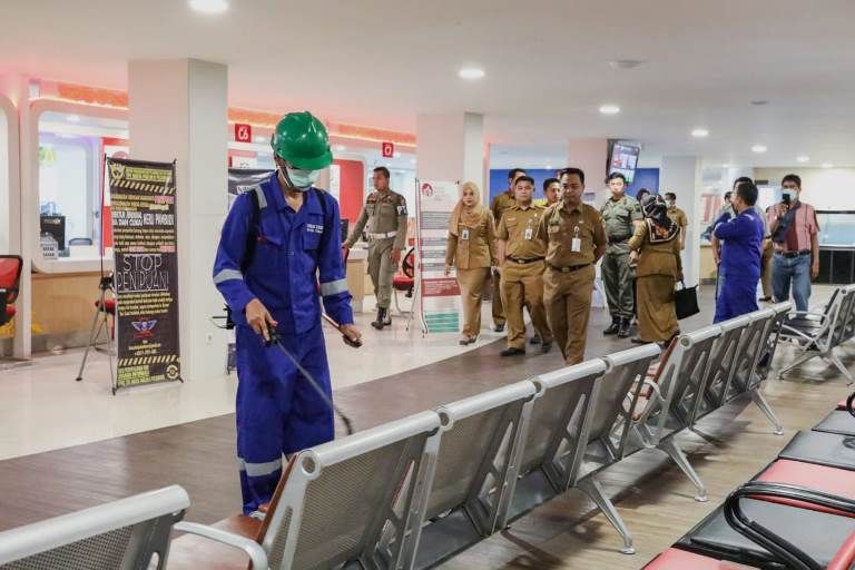 Senin 16 Maret 2020 pagi seluruh ruangan dan loket pelayanan yang ada di MPP Pekanbaru disemprot dengan cairan desinfektan.