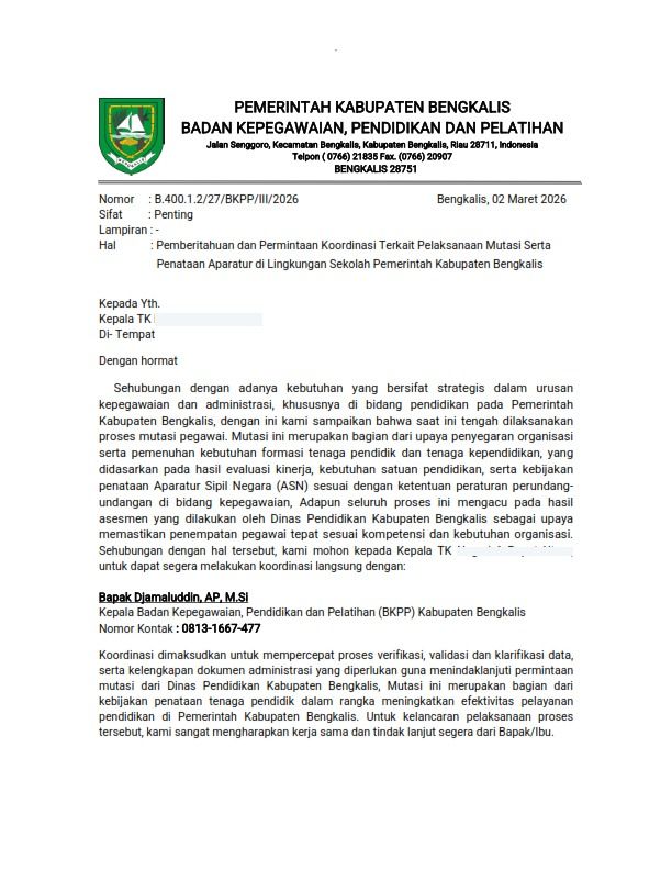 Gaungriau.com -- Sebuah surat palsu yang menyebutkan dirinya dari Badan Kepegawaian, Pendidikan, dan Pelatihan (BKPP) Kabupaten Bengkalis telah menyebar di antara para kepala sekolah dan kepala Taman Kanak-Kanak (TK). Djamaluddin, Kepala BKPP Bengkalis, menyatakan bahwa para pemimpin di kawasan pendidikan sebaiknya tidak mudah terpengaruh.