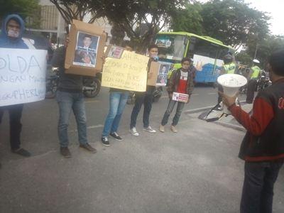 PEKANBARU -- Puluhan mahasiswa yang tergabung dalam Gerakan Mahasiswa Riau (GMR) asal Bengkalis, Kamis 3 Desember 2015 gelar aksi unjuk rasa di Mapolda Riau, Jalan Jendral Sudirman Kota Pekanbaru.