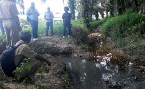 RENGAT -- Badan Lingkungan Hidup (BLH) Kabupaten Indragiri Hulu (Inhu) menurunkan tim ke lokasi Pabrik Kelapa Sawit (PKS) dan sungai di Sungai Pejangki.