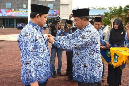 BENGKALIS -- Sekretaris Daerah (Sekda) Bengkalis, Burhanudin dan sejumlah kepala SKPD di lingkungan Pemerintah Kabupaten Bengkalis, Kamis 17 Desember 2015 menerima tanda kehormatan dari Presiden RI berupa anugerah Satyalancana Karya Satya 30 tahun.