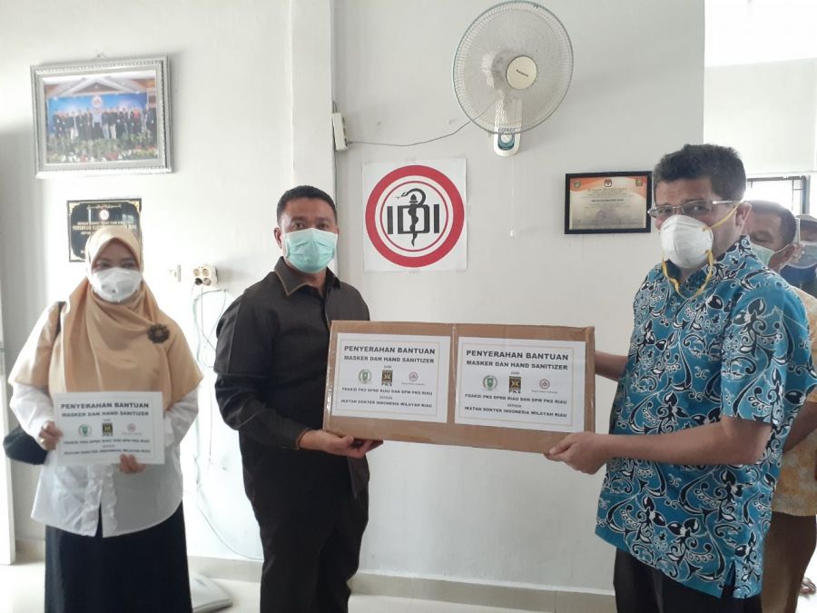 PEKANBARU--Gaungriau.com-- Fraksi PKS DPRD Riau dan Dewan Pimpinan Wilayah (DPW) PKS Provinsi Riau melakukan silaturahim mendistribusikan bantuan ke Ikatan Dokter Indonesia (IDI) Provinsi Riau berupa masker N95 dan hand sanitizer, Selasa 24 Maret 2020 di Kantor IDI Jalan Pelangi Kelurahan Sidomulyo Timur Kecamatan Marpoyan Damai.