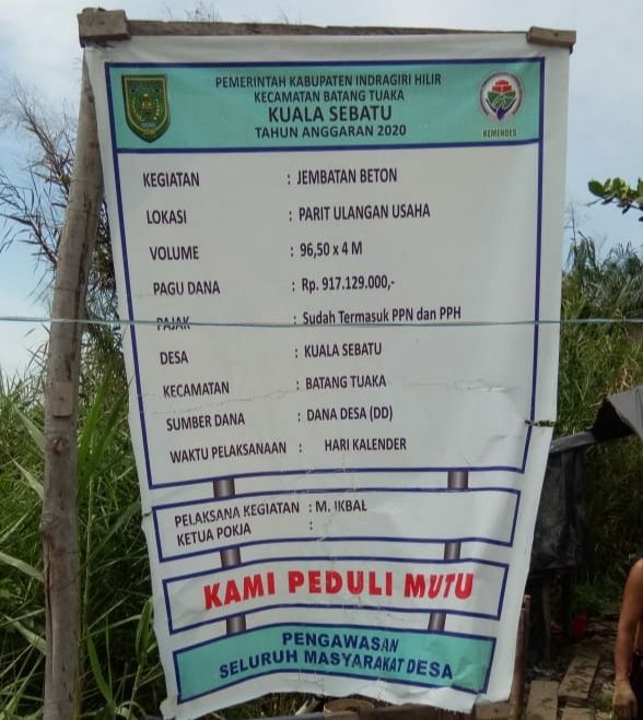 Gaungriau.com (KUALA SEBATU) -- Proyek jembatan di Parit Ulangan Usaha, Desa Kuala Sebatu, Kecamatan Batang Tuaka dengan volume 96.50 X 4 meter dengan total anggaran Rp 917.129.000 tahun anggaran 2020 menggunakan Dana Desa (DD) terkesan janggal. kejanggalan terletak pada papan plang proyek yang tidak mencantumkan lama pekerjaan dan kapan dimulai…