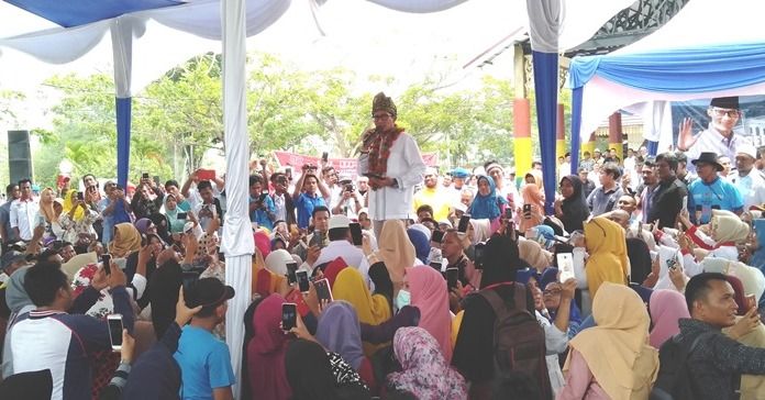 SIAK -- Kedatangan Calon Wakil Presiden (Cawpres) nomor urut 02 H Sandiaga Salahudin Uno ke kota Istana Siak Sri Indrapura senin 4 Maret 2019 disambut antusias masyarakat terutama kaum emak-emak dan kaum melenial.