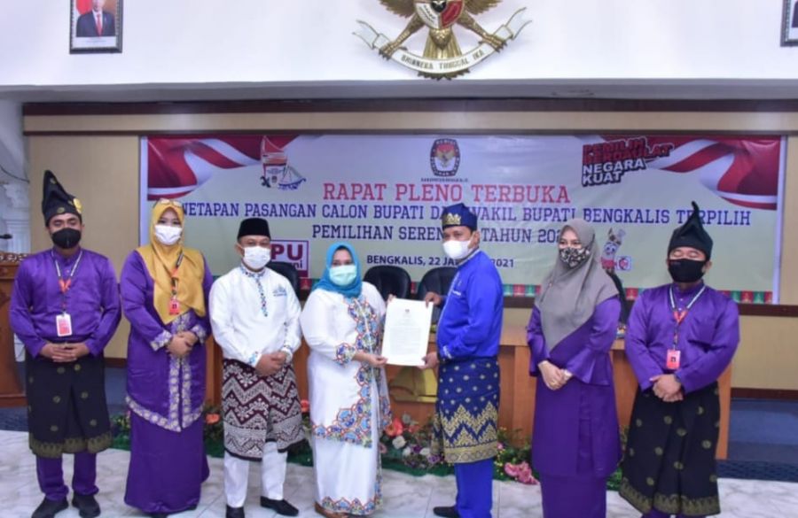 Gaungriau.com (BENGKALIS) -- Komisi Pemilihan Umum (KPU) Kabupaten Bengkalis menggelar rapat pleno terbuka penetapan pasangan calon Bupati dan Wakil Bupati Bengkalis terpilih pada pemilihan serentak Tahun 2020, Jumat 21 Januari 2021 di Gedung Daerah, Bengkalis.