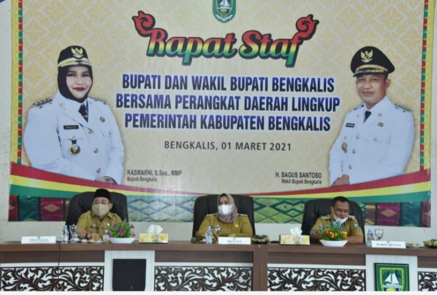 Gaungriau.com (BENGKALIS) -- Bupati dan Wakil Bupati Bengkalis Kasmarni dan H Bagus Santoso, pimpin rapat staf perdana bersama Kepala Perangkat Daerah di Lingkup Pemerintah Kabupaten Bengkalis, Senin 1 Maret 2021 pagi, di Ruang Rapat Dang Merdu Kantor Bupati Bengkalis.