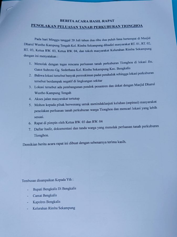 Gaungriau.com -- Masyarakat Kelurahan Rimbasekampung, Kecamatan Bengkalis, dengan tegas menyatakan penolakan terhadap rencana perluasan tanah pekuburan Tionghoa yang terletak di Jalan Gatot Subroto, Gg. Sederhana, Kelurahan Rimbasekampung. Penolakan ini dituangkan dalam berita acara hasil rapat yang digelar pada Ahad, 20 Juli 2025, di Masjid Dharul Wustho, Kampung Tengah.
