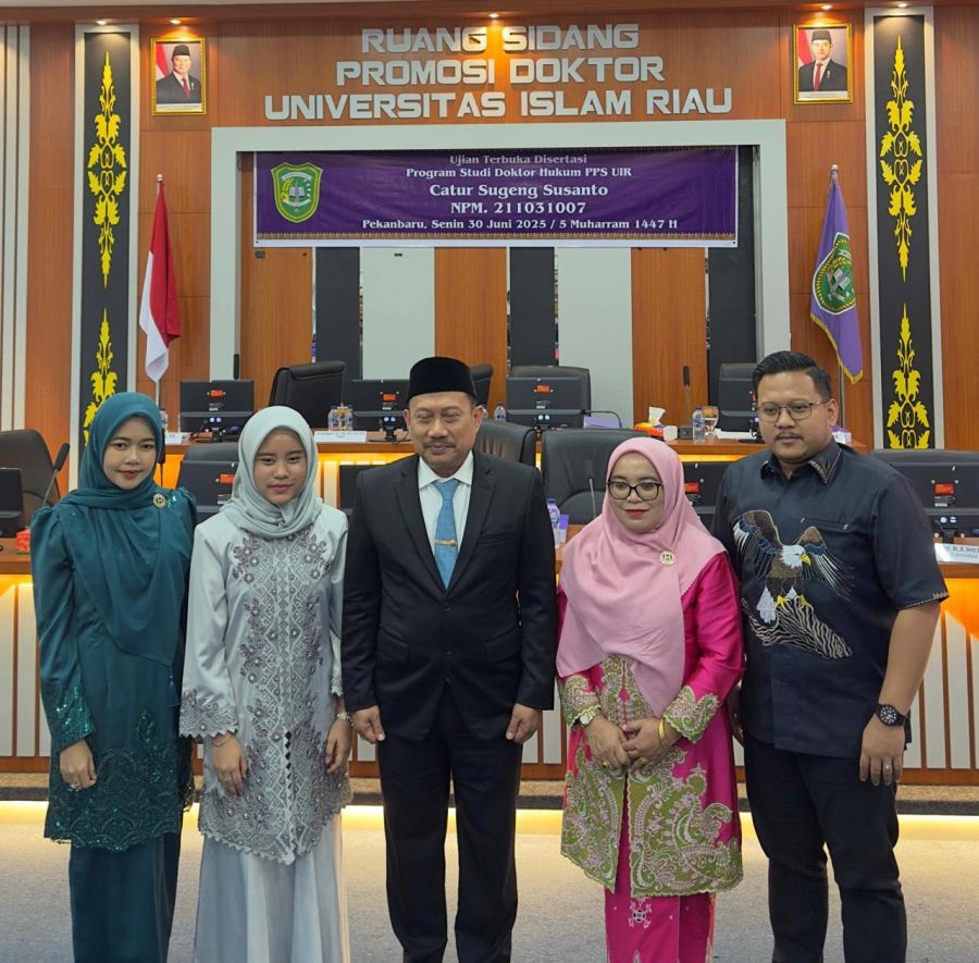Gaungriau.com -- Mantan Bupati Kampar H. Catur Sugeng Susanto, yang memiliki gelar SH, MH, dan MSc, berhasil mendapatkan gelar doktor di bidang hukum dengan nilai sangat baik, yaitu IPK 3,91. Promosi Ujian Terbuka Disertasi Catur diadakan di lantai III Kampus Pascasarjana Universitas Islam Riau, Jalan Kaharuddin Nasution 113, Pekanbaru,…