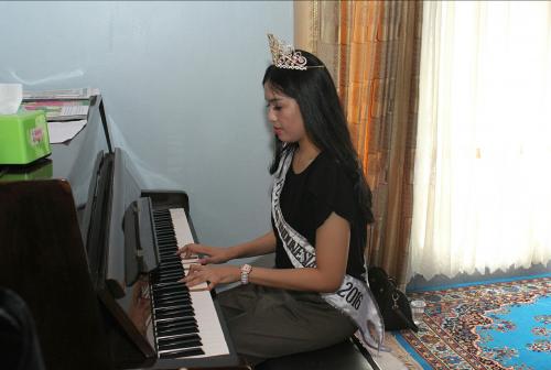 PEKANBARU - Finalis Puteri Indonesia 2016 asal Riau, Kurnia Ilahi, sempat unjuk kebolehannya memainkan piano sambil menyanyikan sebuah lagu di depan Pj Bupati Bengkalis, Ahmad Syah Harrofie, saat diterima di kediaman pribadi orang nomor satu Bengkalis itu di Jalan Tanjung Jaya, Tangkerang, Pekanbaru, Jumat 22 Januari 2016.…