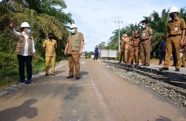 (PUPR) Kabupaten Bengkalis Ardiansyah bersama Penjabat Bupati Bengkalis H Syahrial Abdi melakukan peninjauan pembangunan proyek peningkatan jalan Gajah Mada Kecamatan Pinggir, Kabupaten Bengkalis, Senin 16 Nopember 2020.