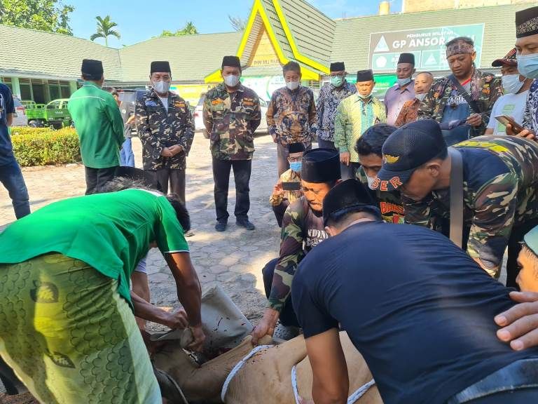 Gaungriau.com (PEKANBARU) -- Sembelih 3 ekor sapi kurban, Gearakan Pemuda Ansor bersama Kanwil Kemenag Riau, dan Pemuda Katolik Riau, jalankan ajaran Islam dan peduli sesama. Penyembelihan Sapi kurban ini dilaksanakan Kamis 22 Juli 22 di di Kantor GP Ansor Riau, Jln KH Dahlan, Pekanbaru.