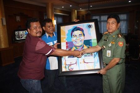PASIR PENGARAYAN -- Ketua Persatuan Wartawan Indonesia (PWI) Kabupaten Rokan Hulu, Feri Hendrawan, Selasa 5 Januari 2016 memberikan Lukisan kepada Bupati Rohul, Drs H Achmad MSi. Lukisan wajah orang nomor satu tersebut merupakan kenang-kenangan dari organisasi wartawan itu di akhir jabatannya. …