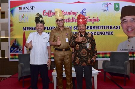 PEKANBARU -- Lembaga Sertifikasi Pariwisata (LSP) Lancang Kuning Nusantara (LKN) gelar kegiatan cofee morning dan sosialisasi tanjak, di Grand Tjokro, Selasa 7 Februari 2017. Hadir sebagai pembicara Deputy Pengembangan Sumber Daya Manusia (SDM) Kepariwisataan dari Kementerian Pariwisata Wisnu Bawa Taruna Jaya, Kadis Pariwisata Riau…