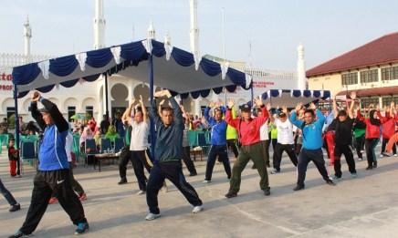 PEKANBARU -- Walikota Pekanbaru yang diwakili oleh Asisten III Drs H Azharisman Rozie MSi, melakukan senam sehat bersama dalam rangka silaturrahmi dengan masyarakat Kelurahan Air Hitam di Halaman Universitas Tabrani Rab Jalan Riau Ujung, Ahad 3 April 2016.