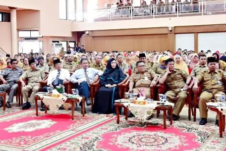TEMBILAHAN -- Bupati Kabupaten Indragiri Hilir (Inhil), HM Wardan bersama Gubernur Riau (Gubri), Arsyadjuliandi Rachman yang diwakili oleh Sekretaris Daerah (Sekda) Provinsi Riau, Ahmad Hijazi bersilahturrahmi dengan Pendidik dan Tenaga Kependidikan SMA / SMK se-Kabupaten Inhil di Gedung Engku Kelana, Tembilahan, Senin 27 Maret 2017.