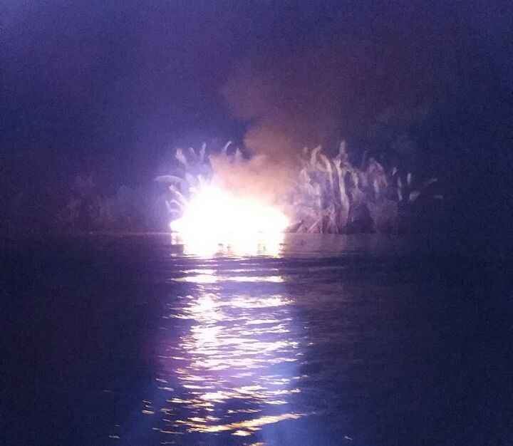 TEMBILAHAN -- Gaungriau.com -- KM. Vega Jaya GT 5 bermuatan sembako dan tabung gas elpiji, terbakar di Perairan Sungai Indragiri Kelurahan Sungai Perak Kecamatan Tembilahan, Kamis, 1 Februari 2018, sekira pukul 20.30 WIB, di Perairan Sungai Indragiri Sungai Perak Kelurahan Seberang Tembilahan Kecamatan Tembilahan Kabupaten Indragiri Hilir.