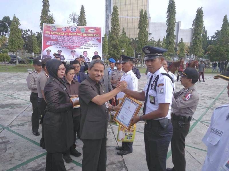 PEKANBARU -- Gaungriau.com -- Sekretaris Daerah Provinsi (Sekdaprov) Riau Ahmad Hijazi menjadi inspektur upacara peringatan Hari Ulang Tahun (HUT) Satuan Pengamanan (Satpam) ke 37 tingkat Provinsi Riau di halaman kantor Gubernur Riau, Sabtu 6 Januari 2018.