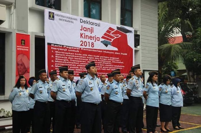 Deklarasi Janji Kinerja dilaksanakan saat apel pagi di halaman Kantor Wilayah Kementerian Hukum dan HAM Riau. Deklarasi diikuti oleh…