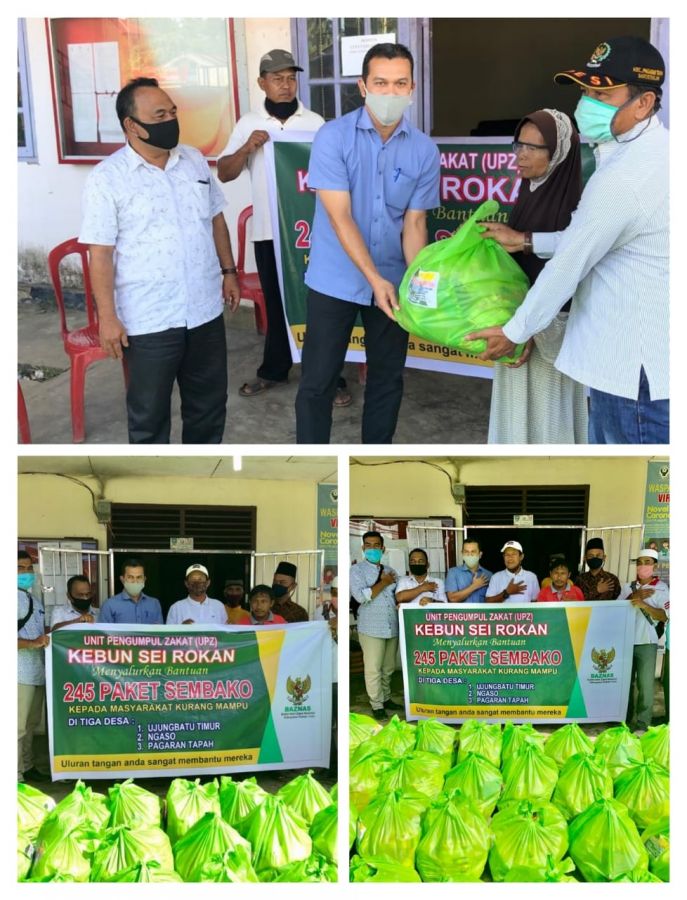Gaungriau.com (UJUNG BATU) -- Ditengah suasana pandemic covid-19, Unit Pengumpul Zakat (UPZ) Kebun PTPN Sei Rokan berbagi salurkan 245 paket sembako kepada masyarakat kurang mampu ditiga desa yang ada dilingkungan kebun.